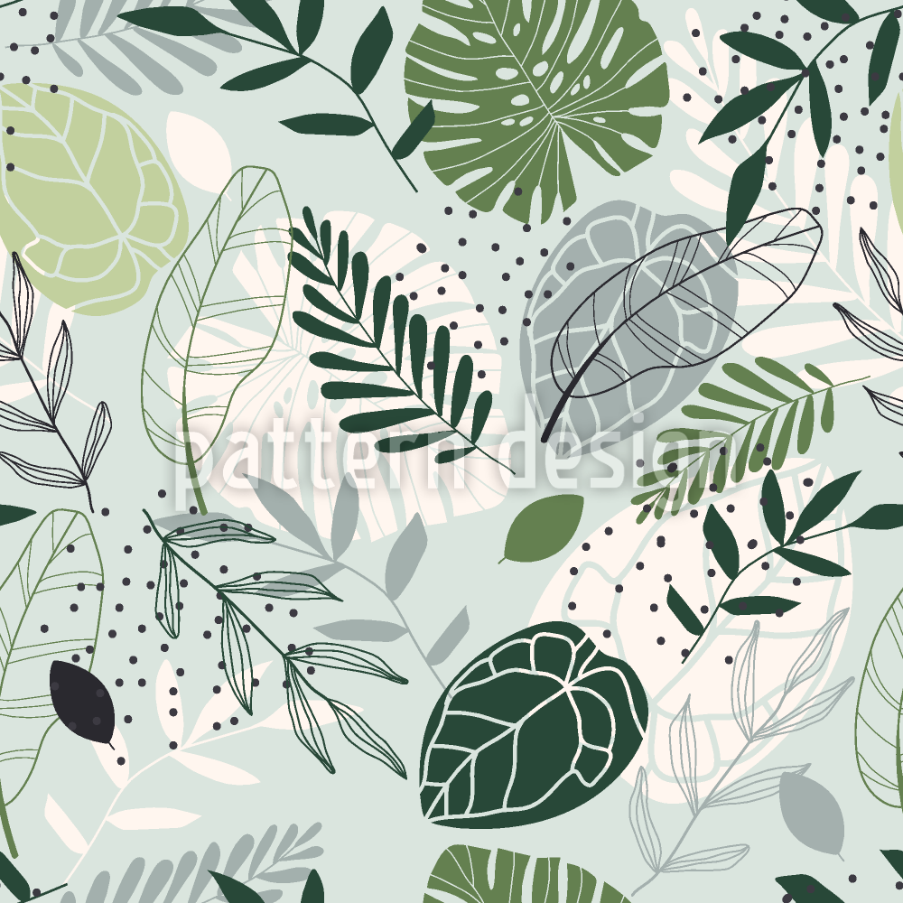 | Beskrivelse | Blomstermønster med tropiske blade og abstrakte streger. | ||