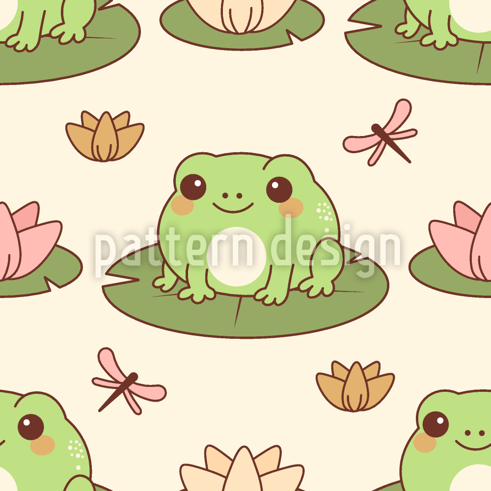 | Beskrivelse | Kawaii-frøer sidder på liljepuder omgivet af pastellotusblomster og flagrende guldsmede. | ||