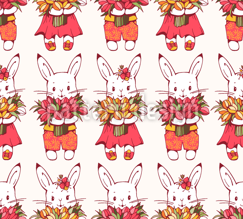 | Beschreibung | Nahtloses Muster mit niedlichen, lustigen Cartoon Hasen mit Blumen. | ||
