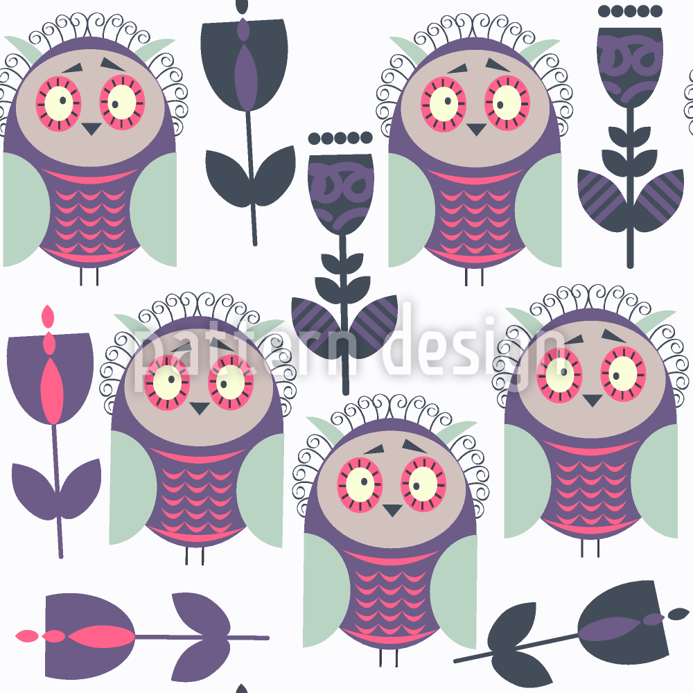 | Beschreibung | Nahtloses Muster mit glücklichen Eulen und Blumen. | ||