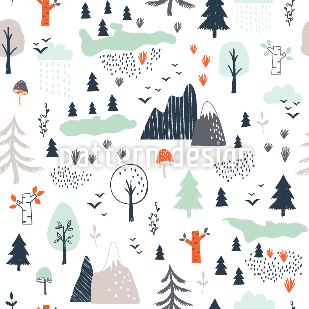 | Beschreibung | Nahtloses Muster mit Bäumen, Bergen und Wolken. | ||