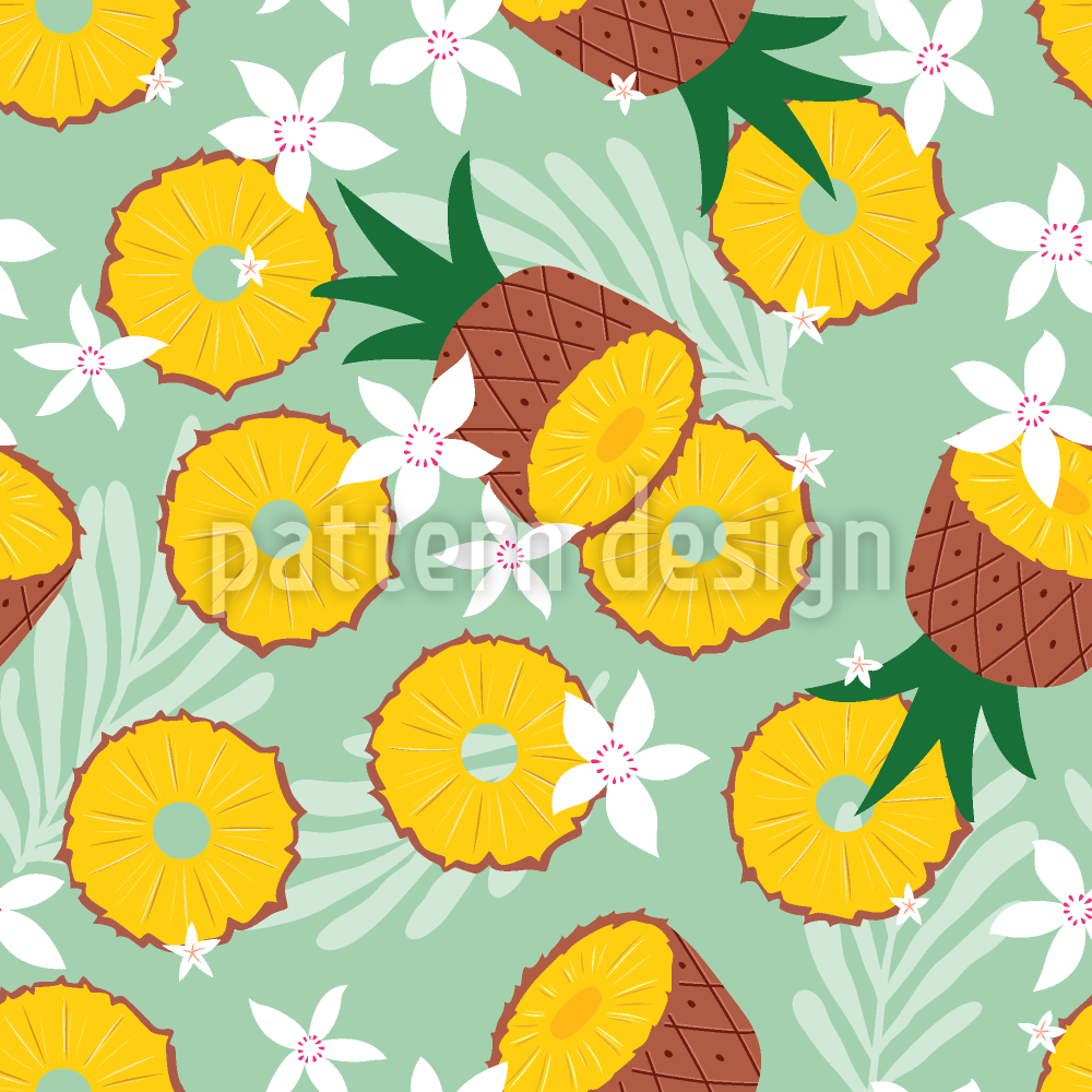 | Beschreibung | Nahtlos fruchtiges Sommermuster mit verstreuten Ananas, Blättern und Blüten. | ||