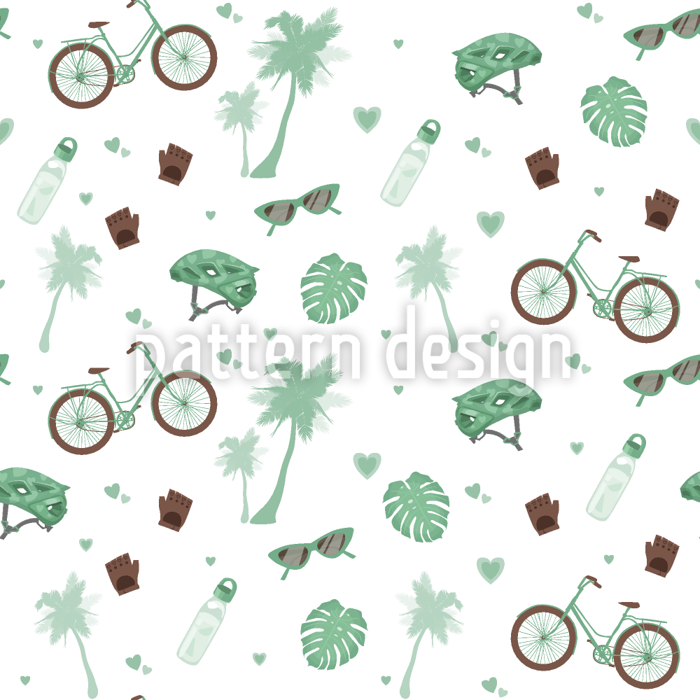 | Beschreibung | Nahtloses Muster mit Fahrrad, umgeben von tropischen Blättern. | ||