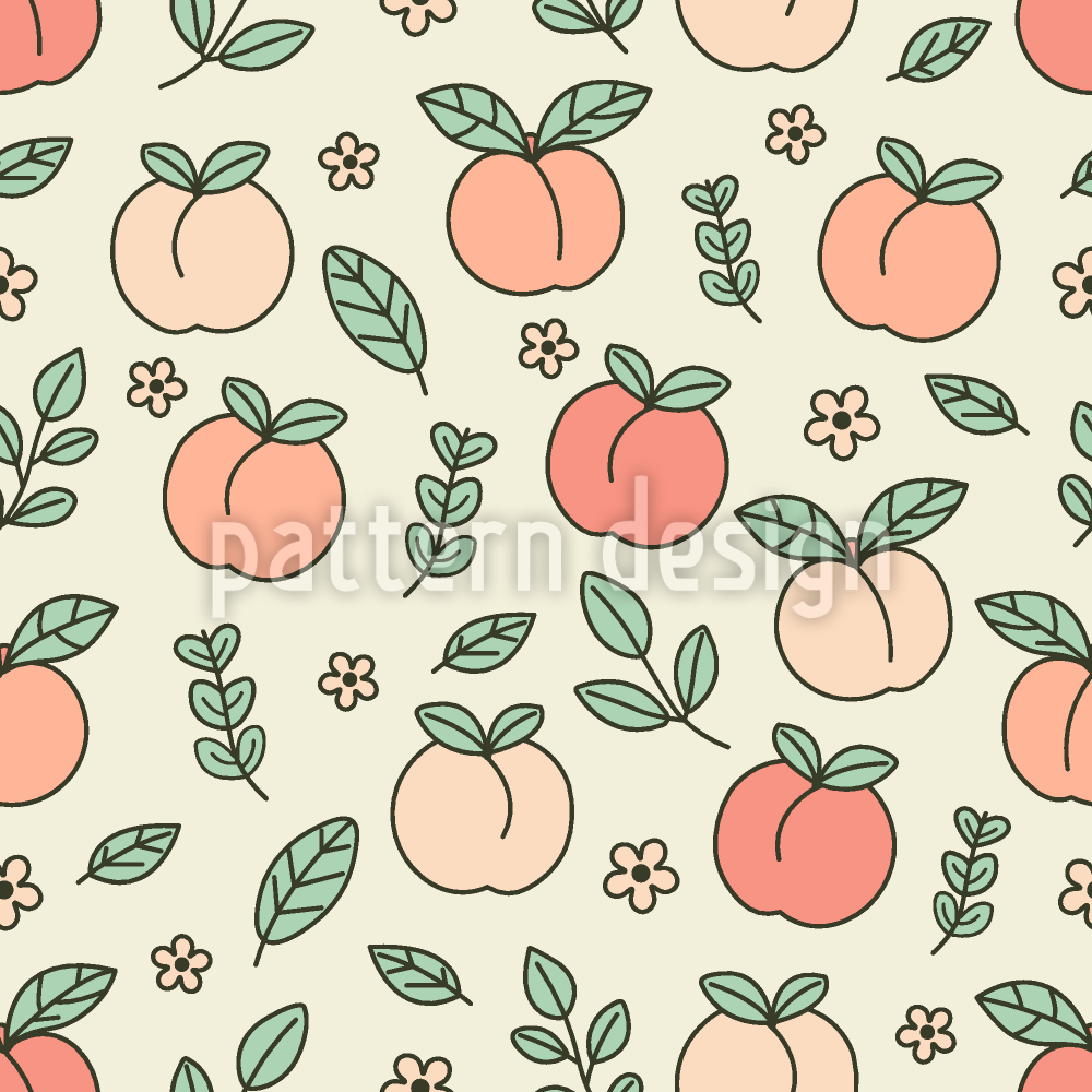 | Beschreibung | Charmantes Muster mit handgezeichneten Pfirsichen, zarten Blüten und üppigen Blättern im Doodle-Stil. | ||