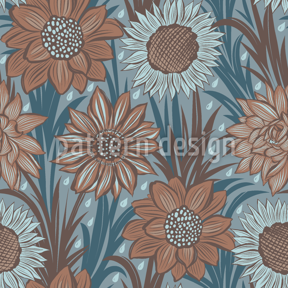 | Beschreibung | Dunkles Blumenmuster mit stilisierten Blüten in dunkleren Erdtönen und Regentropfen. | ||