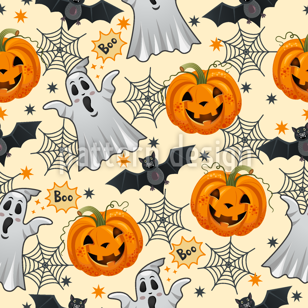 | Beschreibung | Charmantes Halloween-Muster mit Cartoon-Kürbissen, Geistern, Fledermäusen und Spinnennetzen. | ||