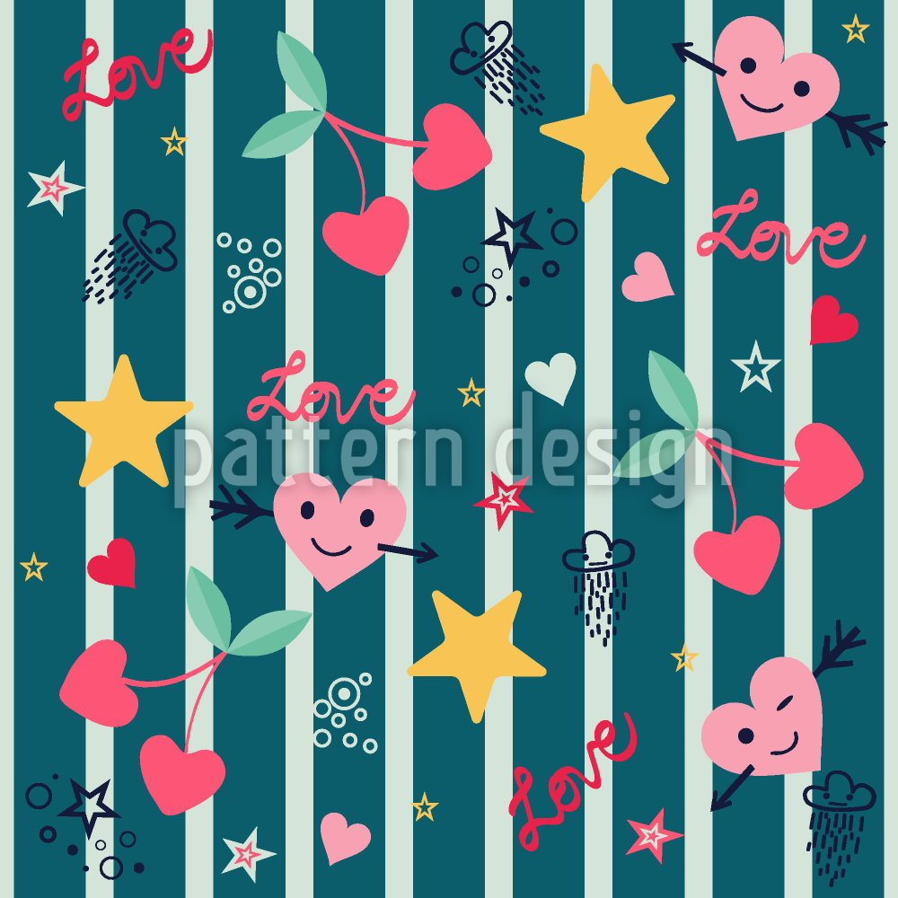 | Beschreibung | Süßes Muster mit Illustrationen zum Thema junge Liebe wie Herzen, Sterne und Kirschen auf gestreiftem Hintergrund. | ||