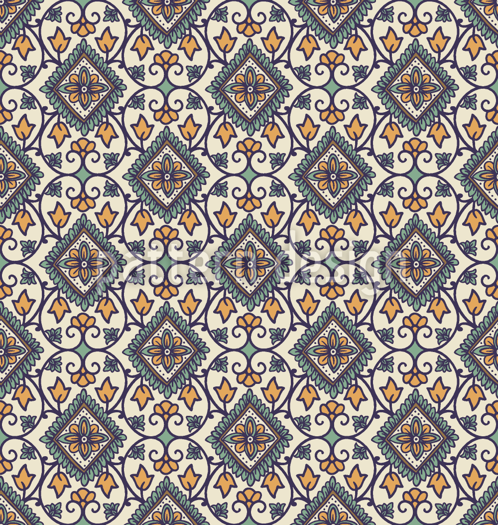 | Beschreibung | Ein elegantes Ornamentmuster mit handgezeichneten geometrischen Diamanten und zarten floralen Rankenmotiven. | ||
