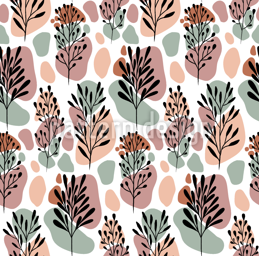 | Beschreibung | Abstraktes Blumenmuster mit Tintenblättern und farbigen organischen Formen. | ||