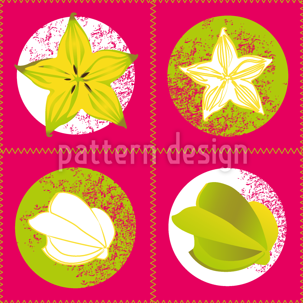 | Beschreibung | Patchwork Design mit Sternfrüchten auf pink-farbenem Hintergrund. | ||