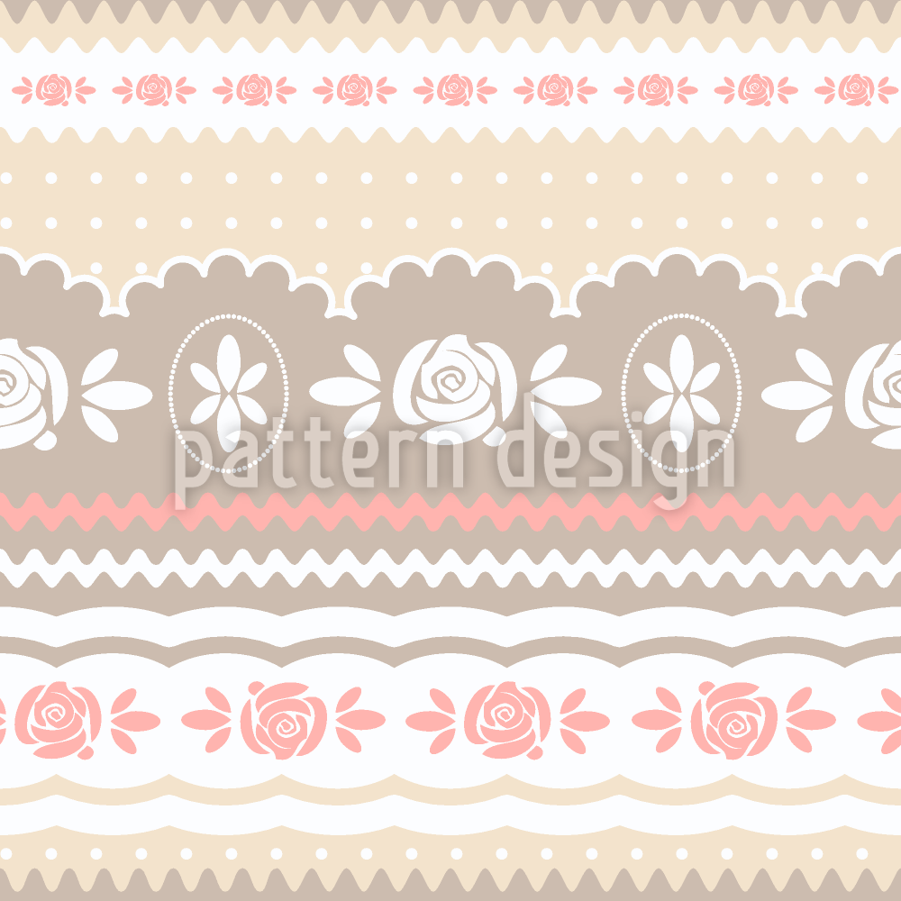 | Beschreibung | Zartes Bordüren-Design mit Rosen, Punkten und Zackenlitze. | ||