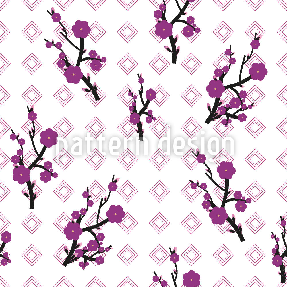 | Description | This design shows branches with cherry blossoms on a geometrical background. | ||