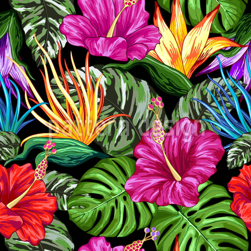 | Description | Exotic seamless pattern with tropical plants, leaves and flowers. | ||