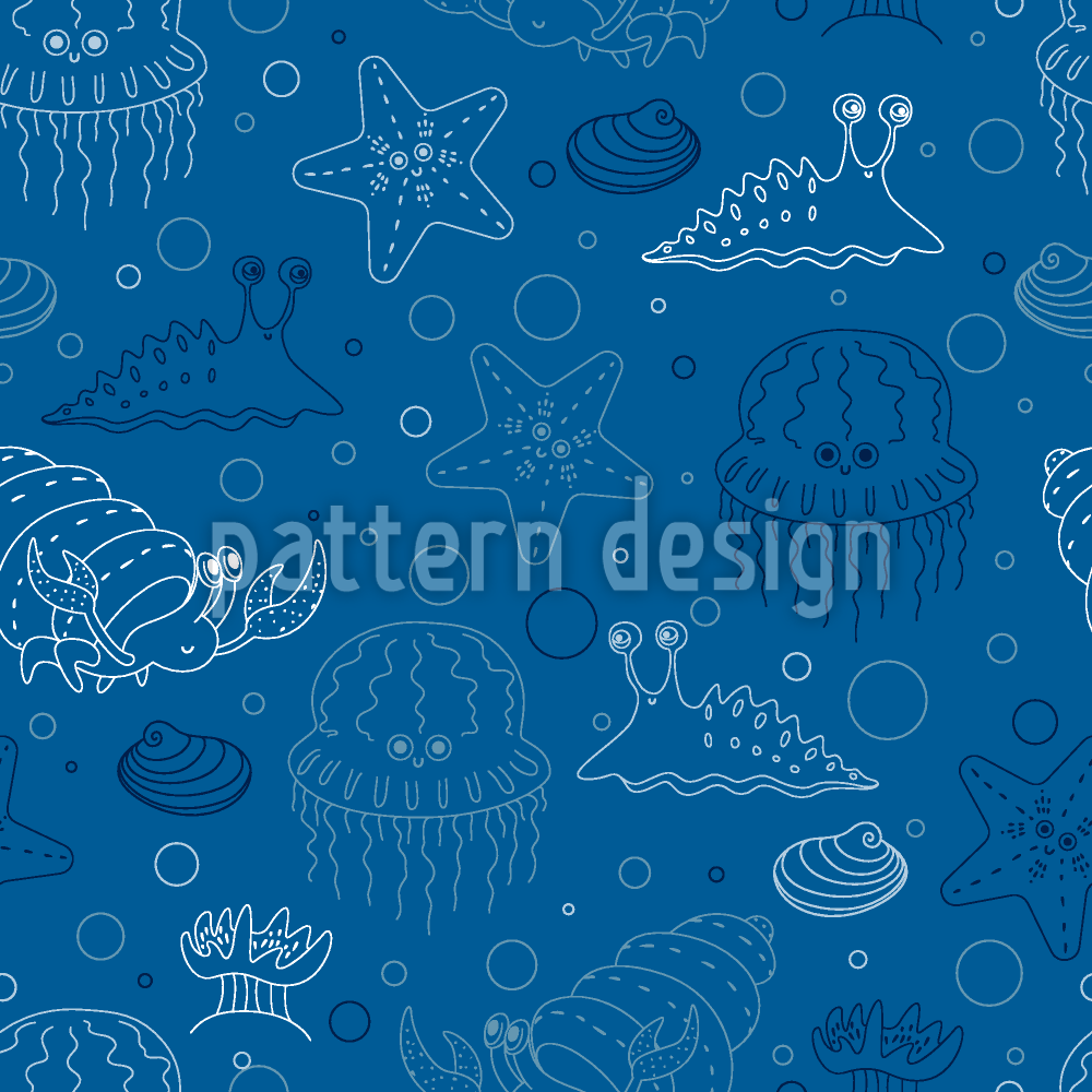 | Description | Underwater themed repeat pattern with hermit crabs, starfish, shells and slugs. | ||