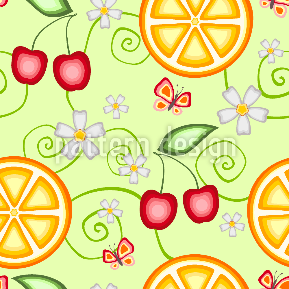 | Description | Stylized fruity pattern design with scattered sweet oranges, cherries, butterflies and blossoms. | ||