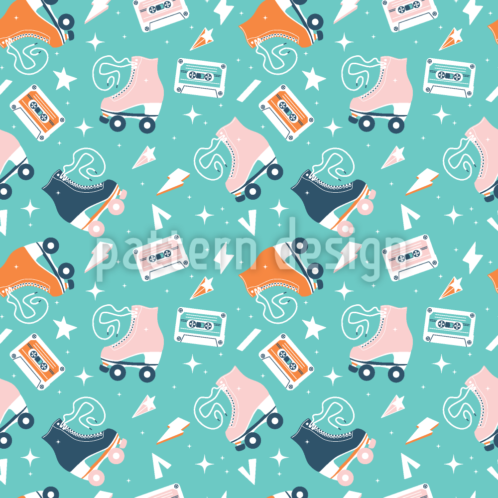 | Description | Seamless retro pattern with scattered roller skates, cassette tapes, shooting stars and lightnings. | ||