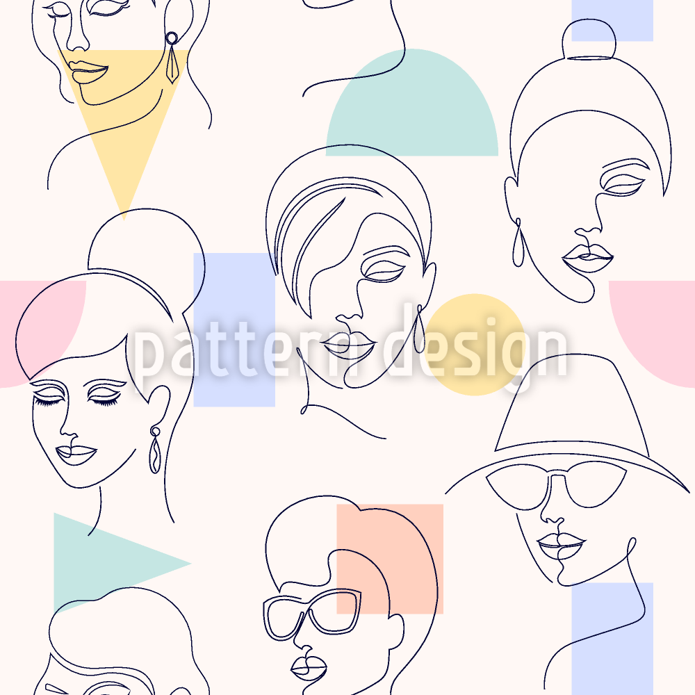 | Description | Seamless one line pattern with scattered faces of women on geometric shapes. | ||
