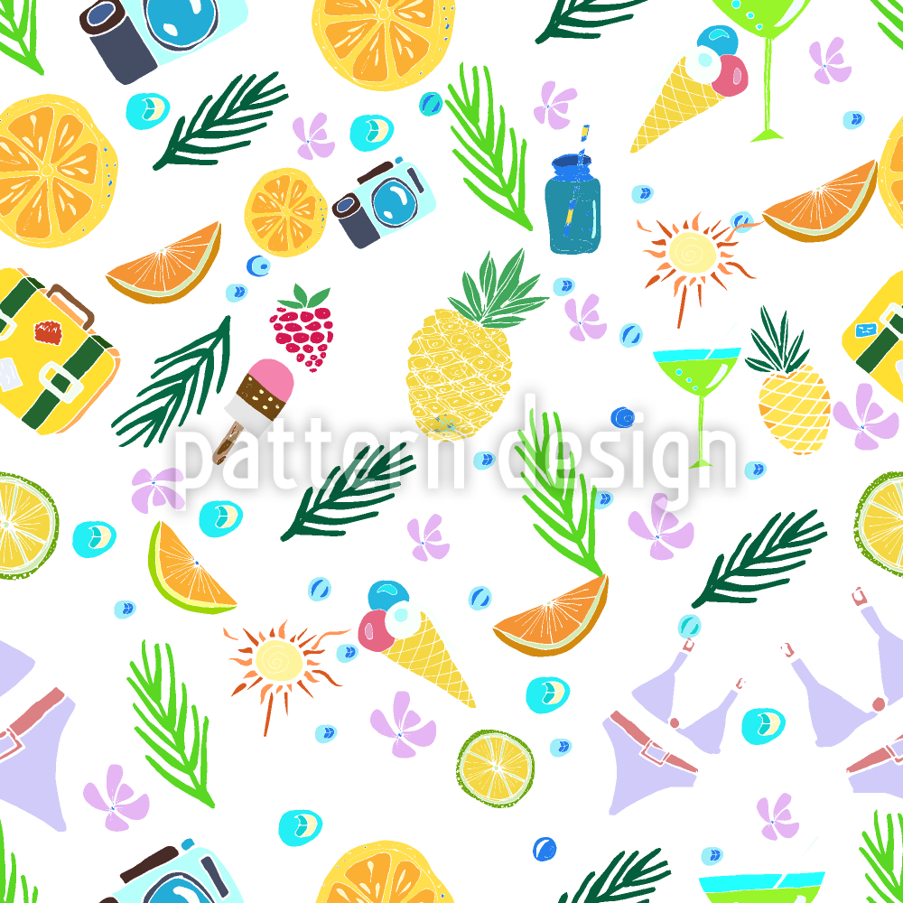 | Description | Seamless pattern with fresh fruits, sunshine, cameras, palm leaves, ice cream, swimsuits, suitcases and more. | ||