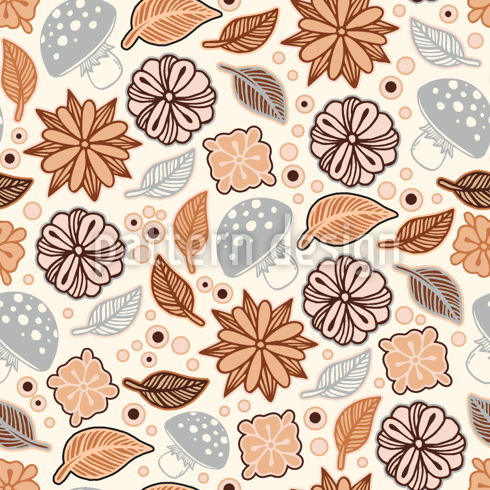 | Description | Hand Drawn pattern of stylized flowers looking like spice stars, leaves and mushrooms giving off a sticker aesthetic. | ||