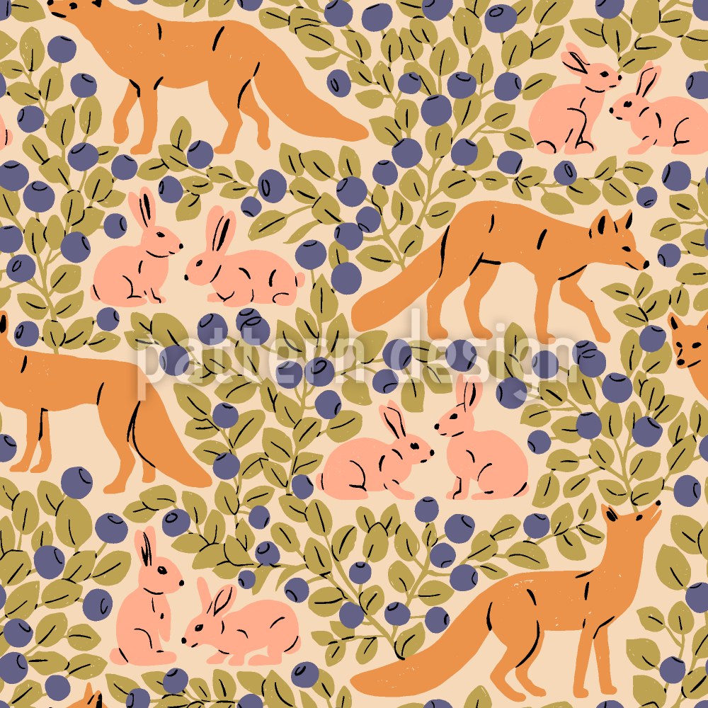 | Description | Cute scenic pattern with foxes and bunnies surrounded by a blueberry bushes. | ||