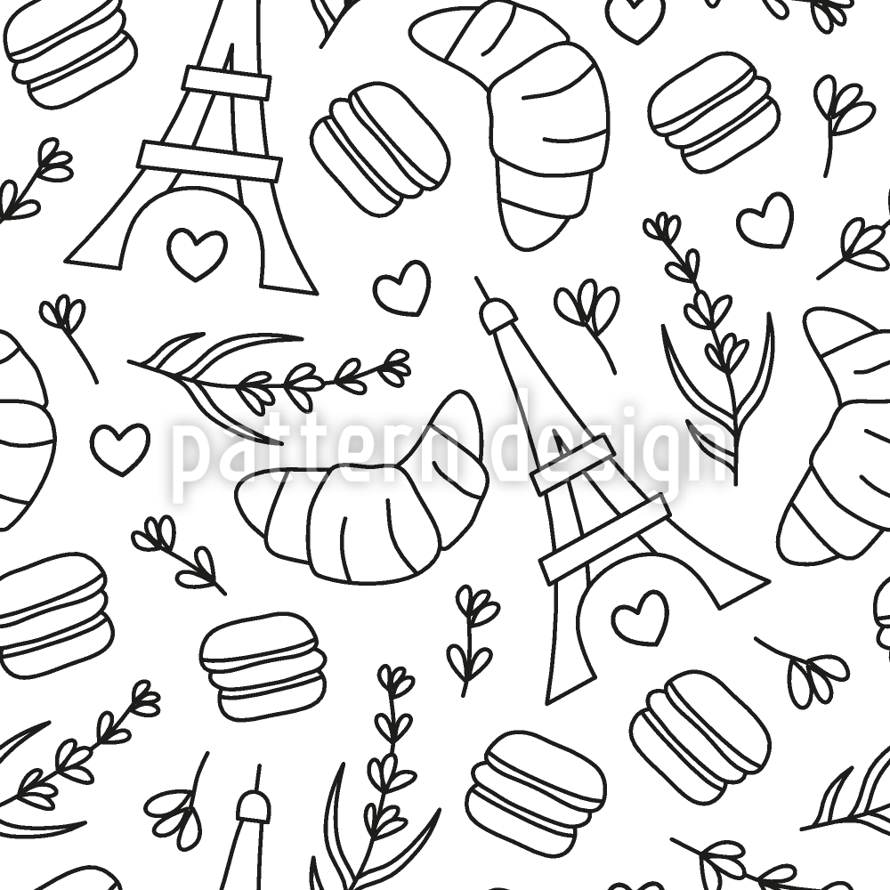 | Description | Black and white doodle pattern with Line Art macarons, Eiffel tower, lavender, twigs, hearts and croissants. | ||