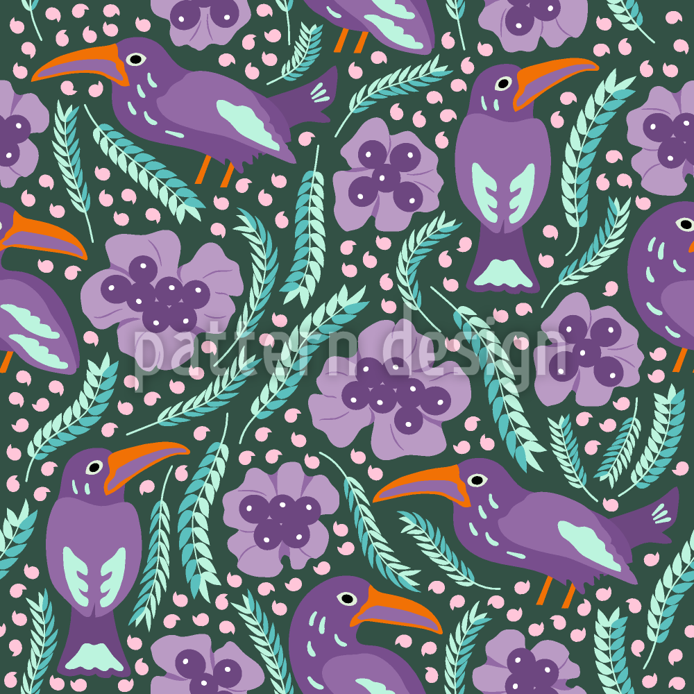 | Description | Stylized pattern with toucans and floral elements such as blossoms and leaves. | ||