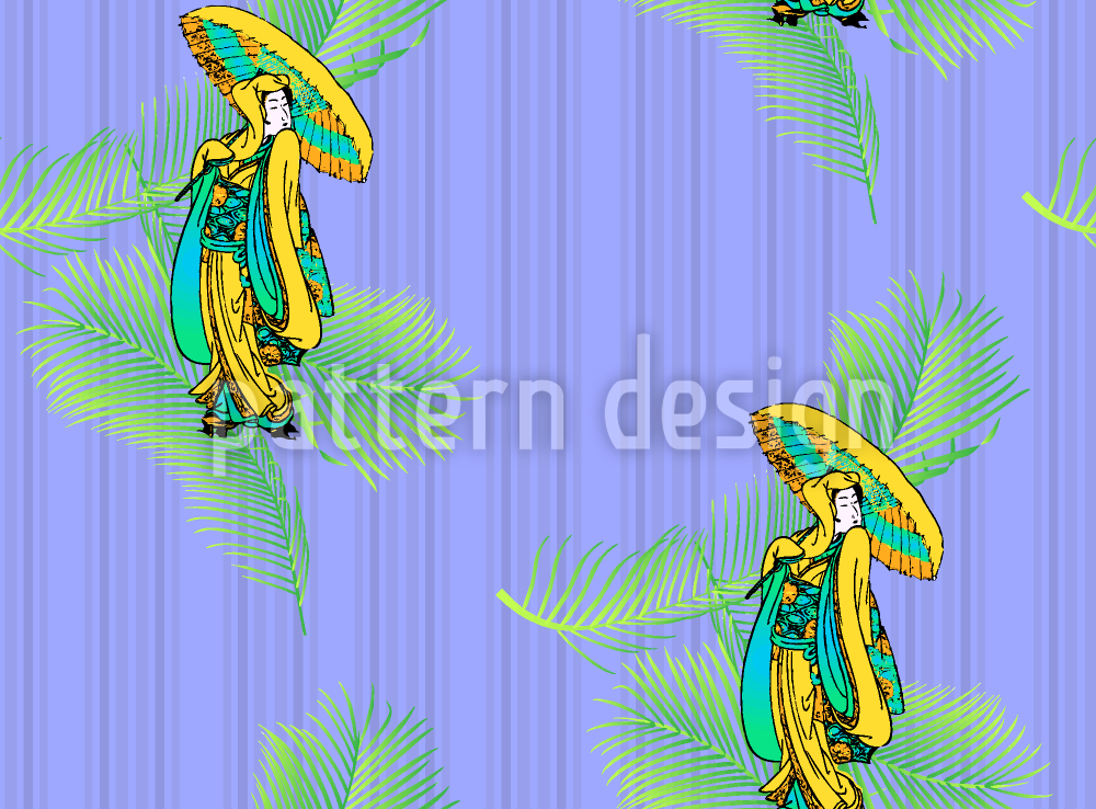 | Description | Chic and vain! Geisha aground with parasol on tropical leaves and blue stripes. | ||