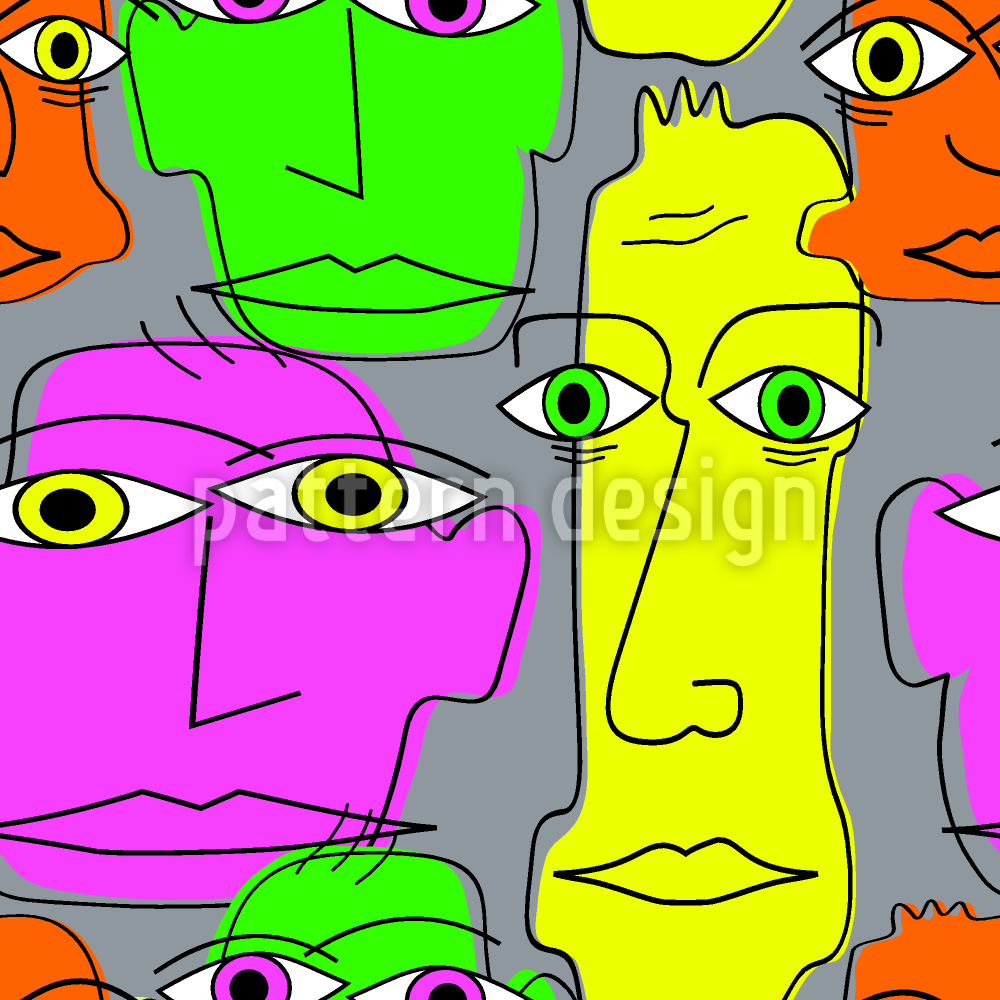 | Description | "We're always with you". Stylized head oranaments in neon colors on a grey colored background. | ||