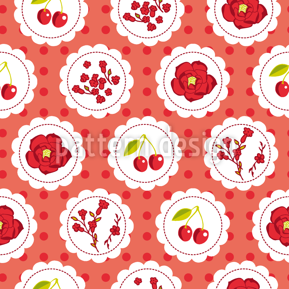 | Descripción | Bienvenido a Grannys Garden! Delicioso diseño nostálgico con cerezas rojas dulces y flores. | ||
