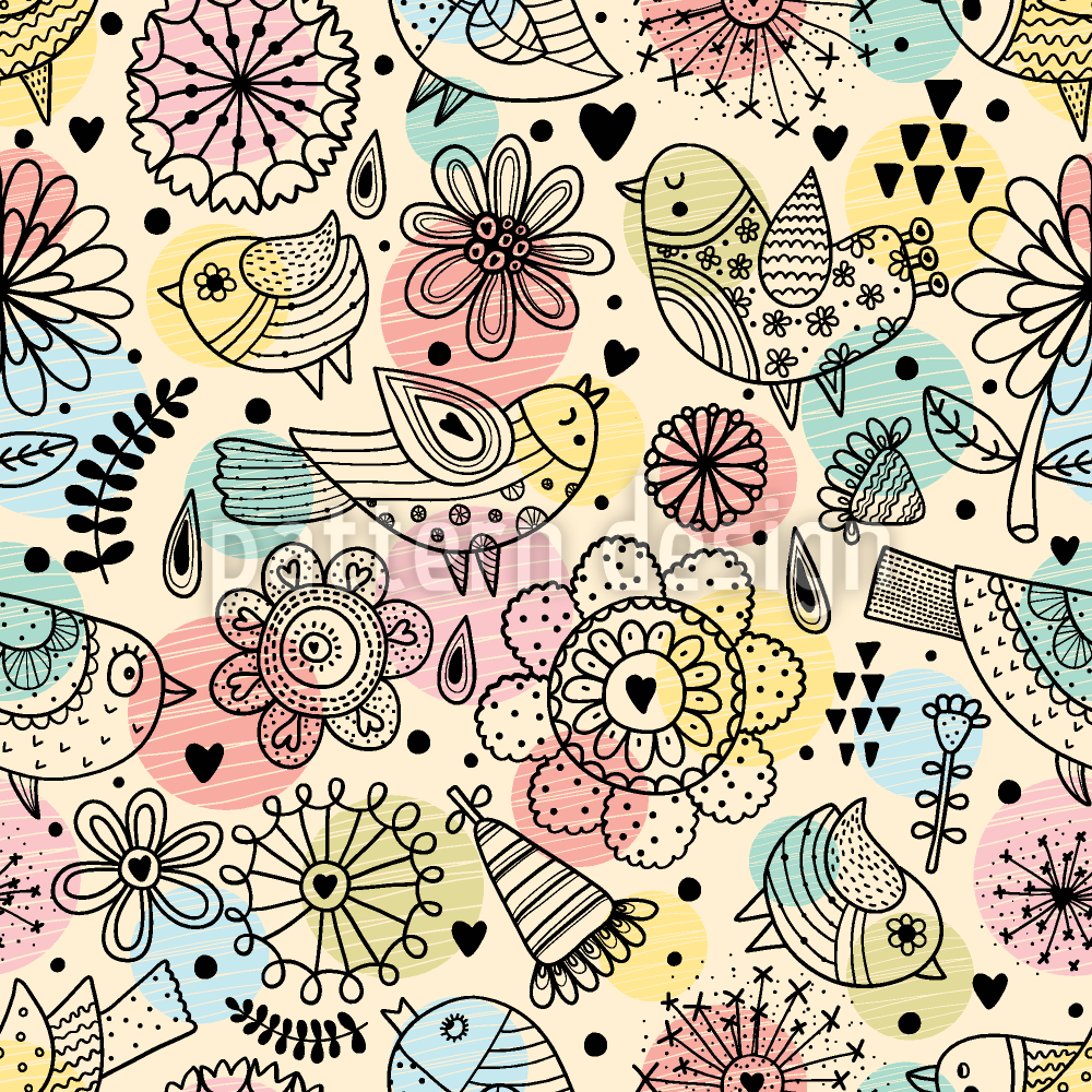 Flores de pájaros y lunares Estampado Vectorial Sin Costura