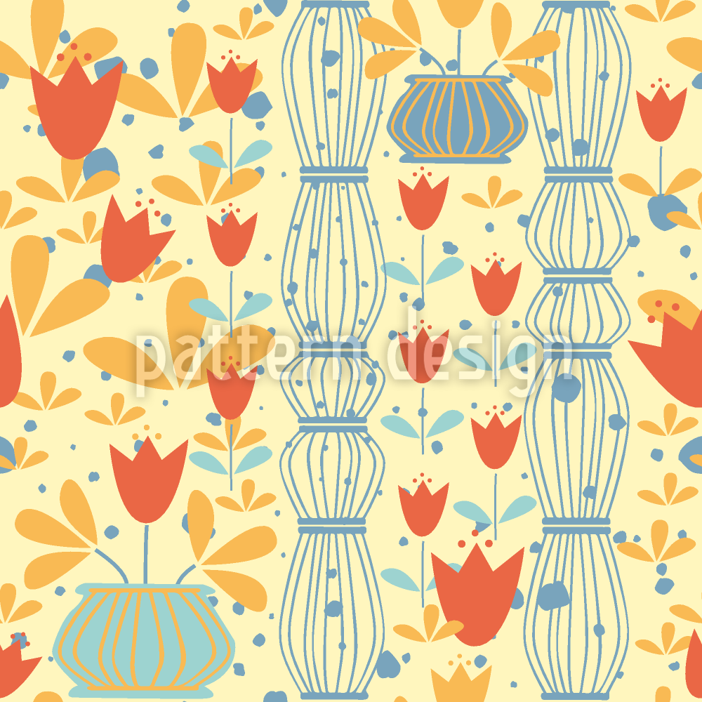 | Descripción | Patrón vectorial perfecto con tulipanes en jarrones. | ||