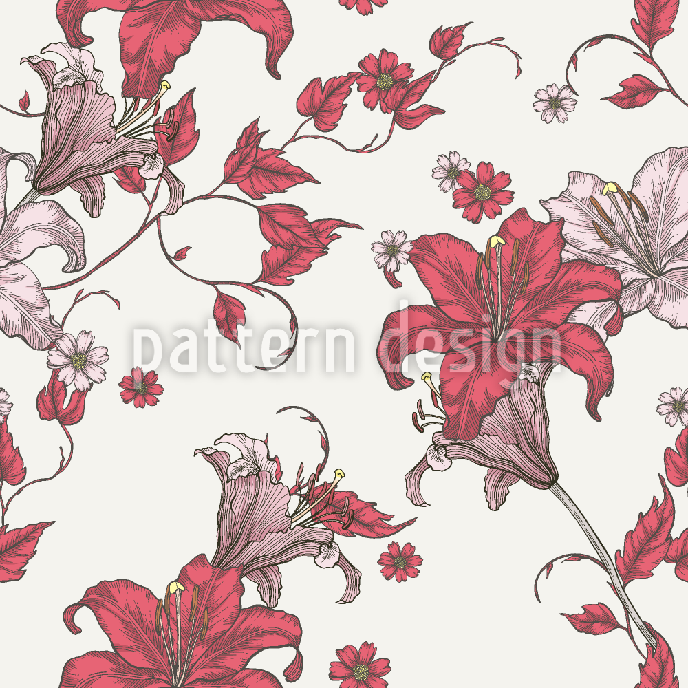 | Descripción | Patrón floral sin fisuras de lirios rojos y blancos, delicadas enredaderas y pequeñas margaritas. Las flores están dibujadas en un estilo vintage detallado y están dispuestas sobre un fondo marrón claro. | ||