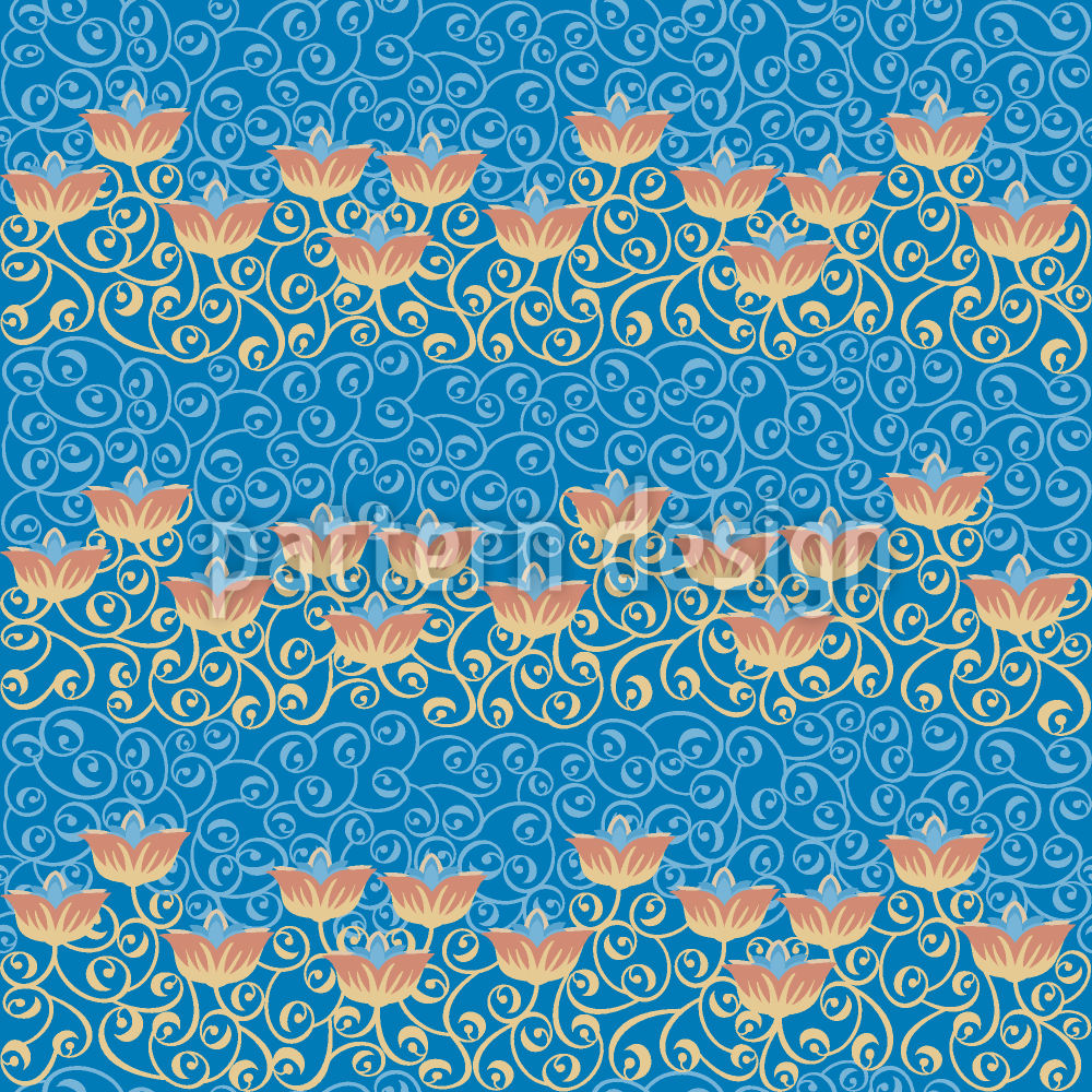 | Descripción | Patrón con arabescos y flores estilizadas que contienen etéreos tonos azules. | ||