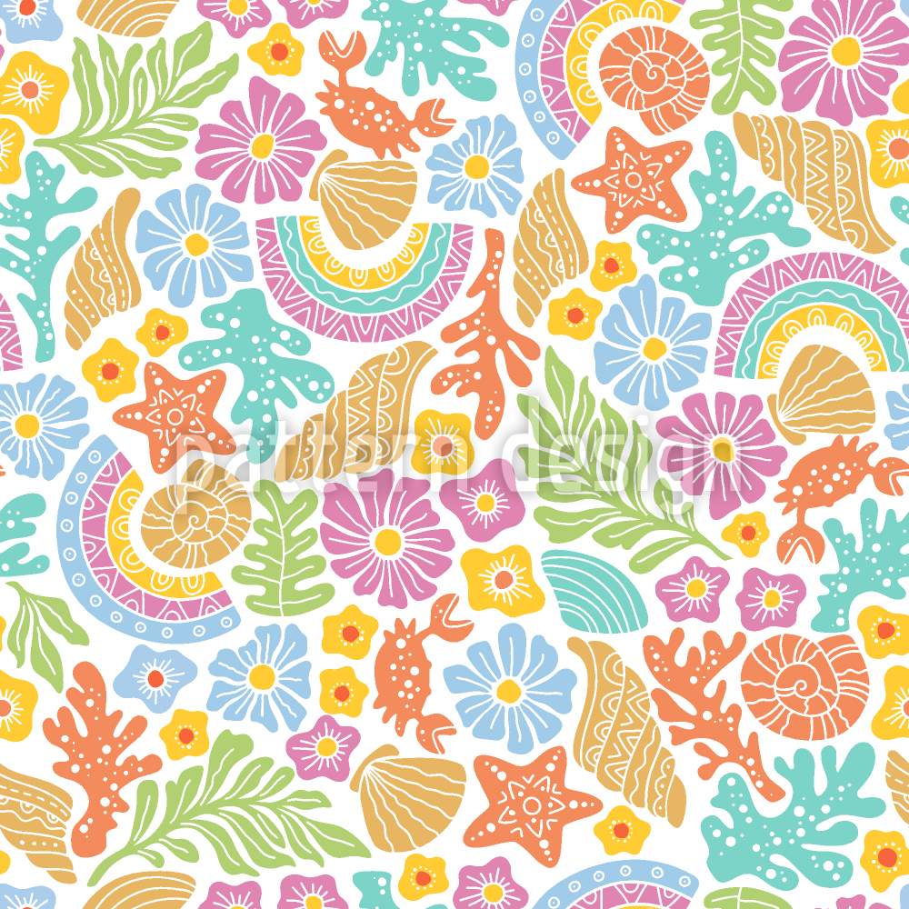 | Descripción | Divertido patrón marino pastel dibujado a mano con conchas, corales, flores y estrellas. | ||