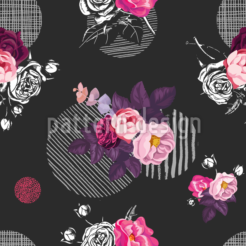 | Description | Motif floral sans couture avec des bouquets de fleurs de rose sauvage et des éléments ronds de différentes textures. | ||