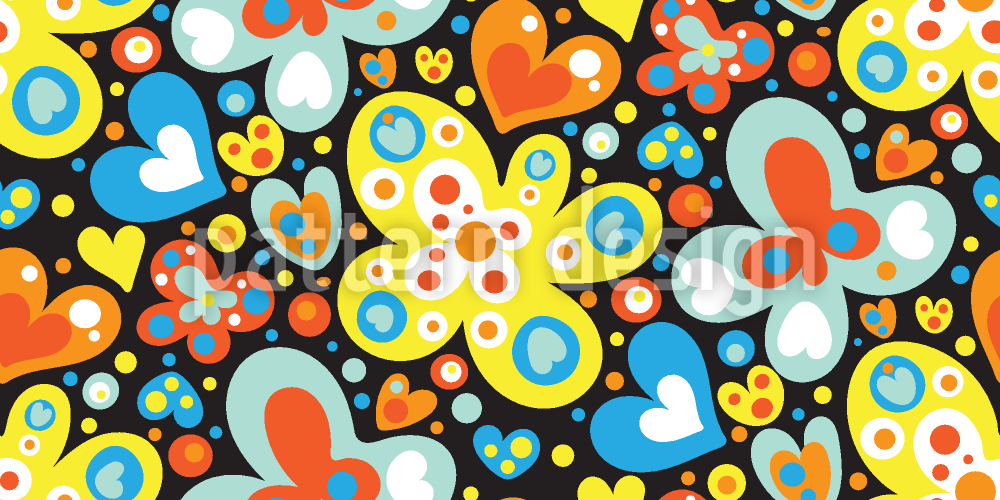 | Description | Un motif sans couture d'inspiration rétro vibrant avec un collage fantaisiste de papillons stylisés, de cœurs et de pois. | ||