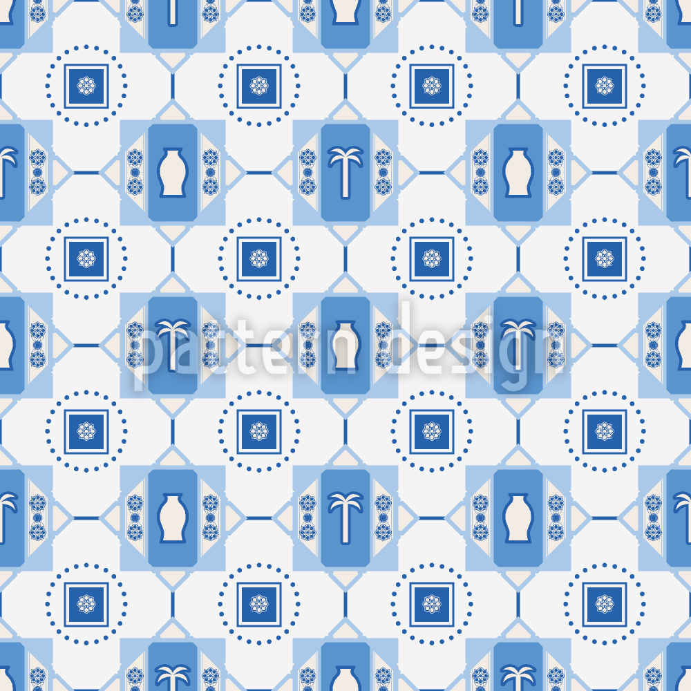 | Description | Un motif de carrelage géométrique moderne inspiré de la céramique méditerranéenne avec des silhouettes minimalistes de palmiers et de vases. | ||