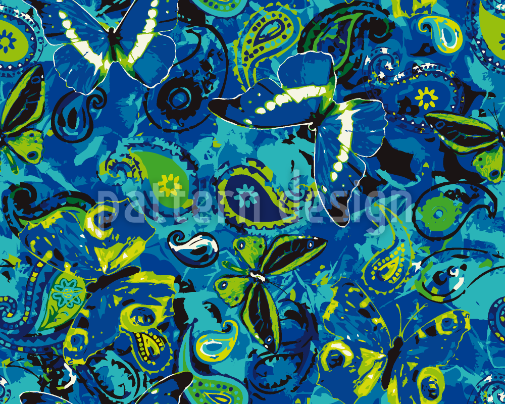 | Description | Motif papillon coloré sauvage avec des éléments cachemire sur un fond de couleur turquoise. | ||