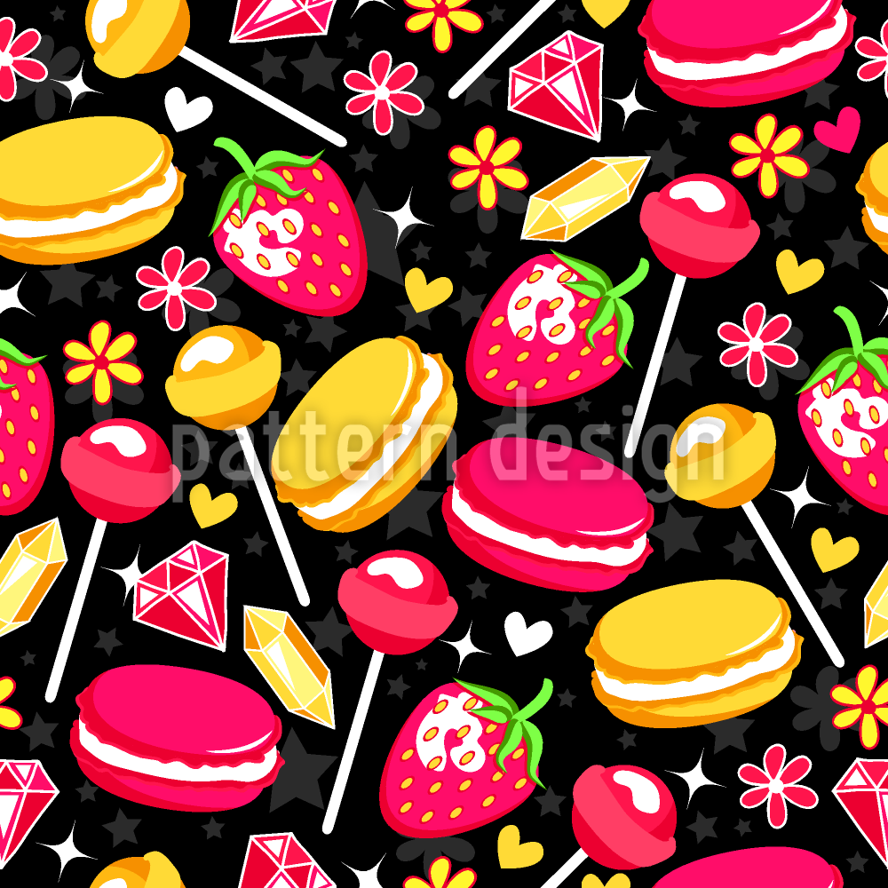 | विवरण | लॉलीपॉप, मैकरून स्ट्रॉबेरी, हीरे, फूल, दिल और सितारों के साथ पॉप कला शैली में मीठा पैटर्न। | ||