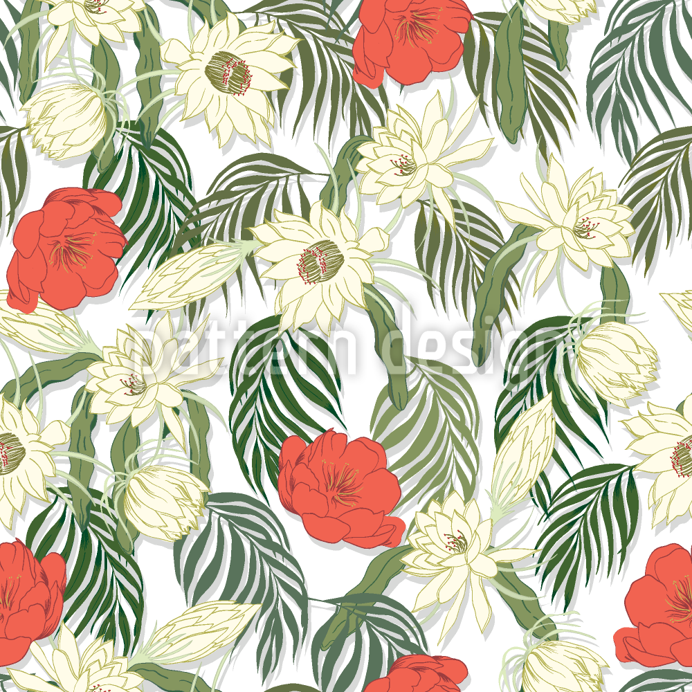 | विवरण | उष्णकटिबंधीय फूलों और पत्तियों के साथ निर्बाध पैटर्न। | ||
