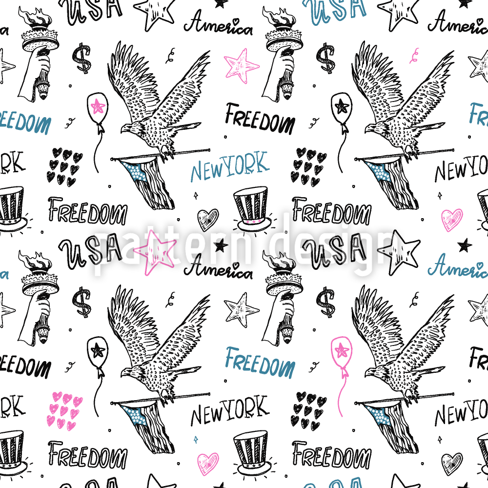 | विवरण | स्टैच्यू ऑफ लिबर्टी, फ्लैग और ईगल जैसे बिखरे हुए अमेरिकी प्रतीकों के साथ निर्बाध मोनोक्रोम पैटर्न डिजाइन। | ||