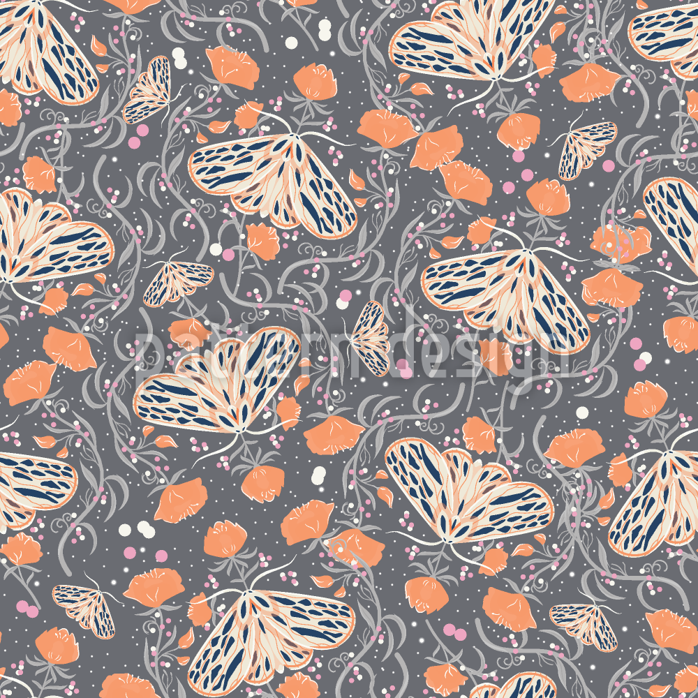 | विवरण | पतंगों और पुष्प रूपांकनों का निर्बाध पैटर्न। | ||