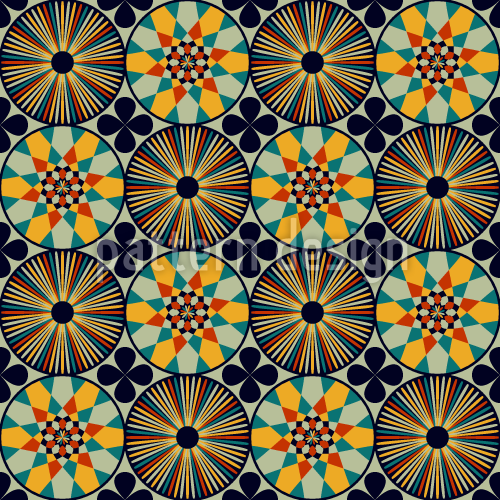| विवरण | गर्म रेट्रो रंगों में रेडियल मोज़ेक तत्वों वाला एक कलात्मक पैटर्न और उदासीन स्वभाव। | ||