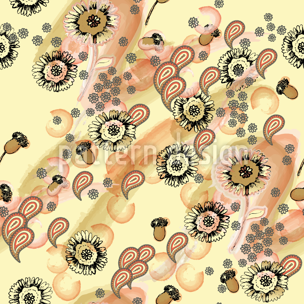 | Descrizione | Fiori di fantasia su fondo di colore giallo-verde. | ||