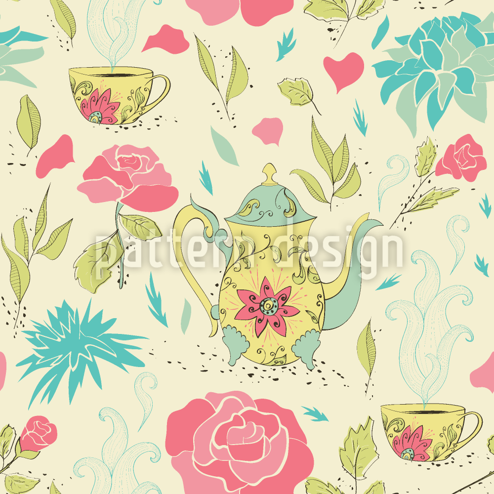 | Descrizione | Modello senza cuciture con tazze da tè disegnate a mano e teiere circondate da fiori e foglie di tè. | ||