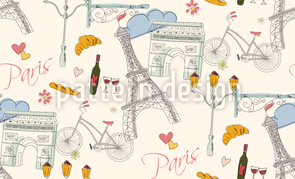 | Descrizione | Motivo a tema parigino con torre Eiffel, porta trionfale, bicicletta e cibo francese. | ||