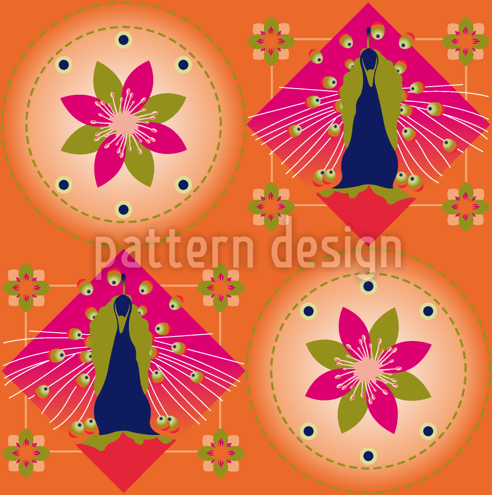 | Descrizione | Design della superficie con pavoni e fiori su sfondo arancione. | ||