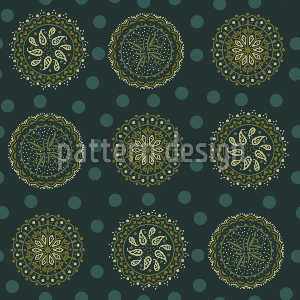 | Descrizione | Paisley stilizzati di fiori e foglie in cerchi con sfondo coriandoli. | ||