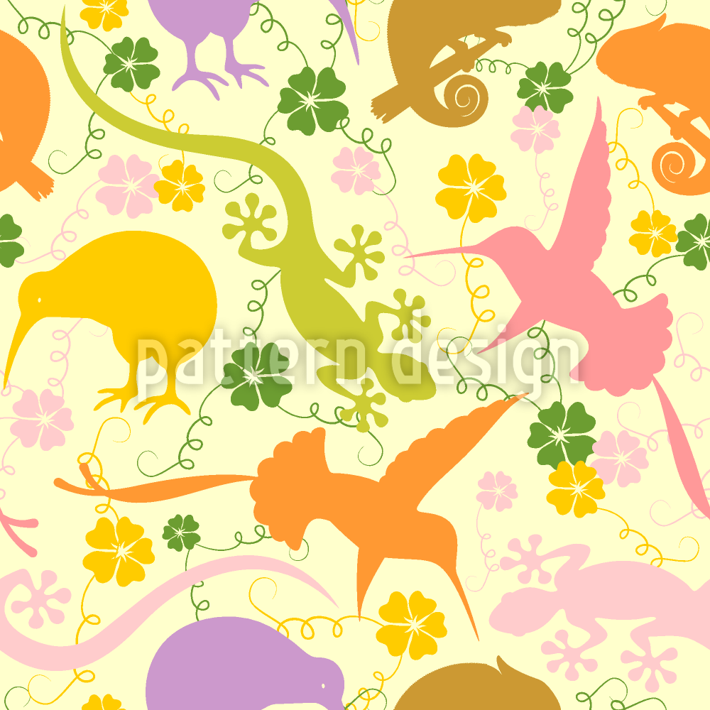 | Descrizione | Camaleonti, gechi, kiwi, colibrì e alcuni fiori e turbinii tutti assemblati per comporre un gioioso motivo esotico. | ||