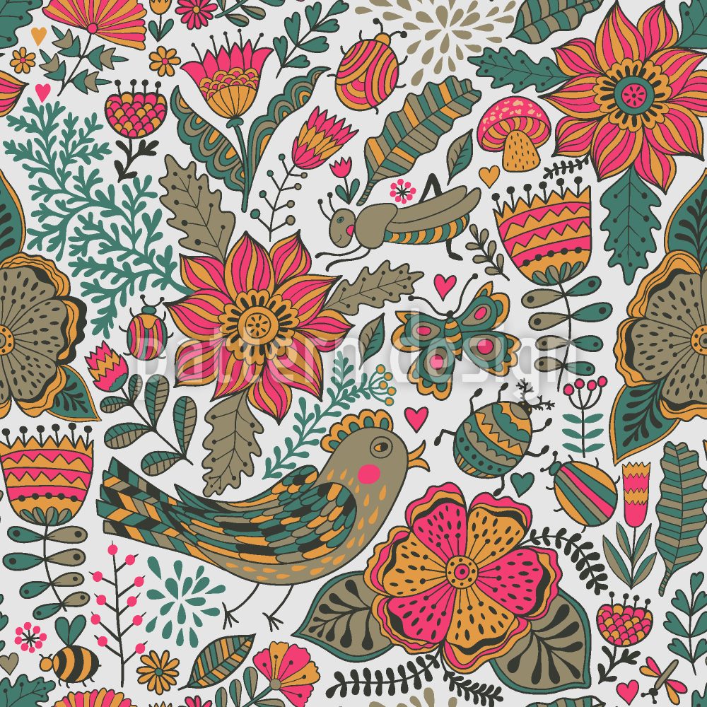 | Descrizione | Modello di natura stilizzata senza soluzione di continuità con fiori sparsi, foglie, uccelli, coleotteri e api. | ||